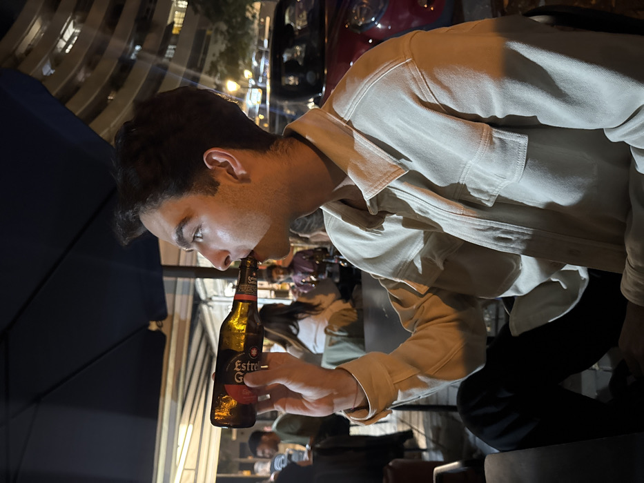 A young adult male, approximately mid-20s, is depicted in profile, actively drinking from a brown glass bottle of Estrella Galicia beer