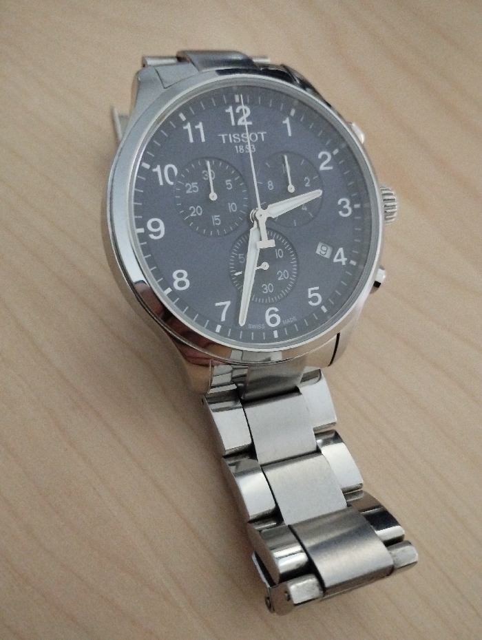- "A Tissot chronograph wristwatch, predominantly silver-toned and metallic, is depicted resting at an oblique angle on a light-colored wooden surface" by FM-oqJ7s2, licensed under CC BY 4.0