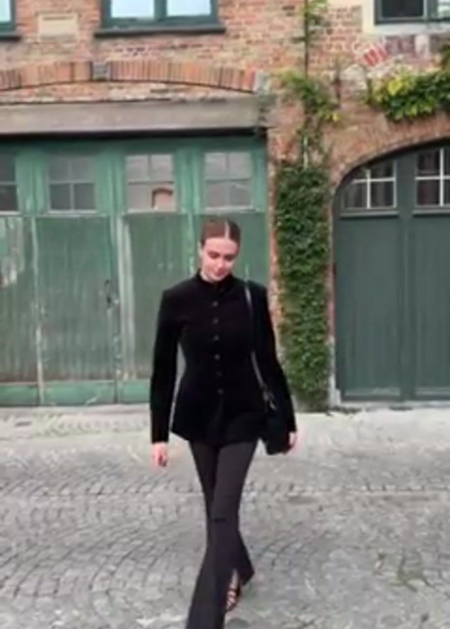 A young, fair-skinned woman walks toward the camera, then stops and offers an air kiss to the viewer. She is wearing a fitted black velvet jacket, black pants with slits at the ankle, and black heeled sandals. The woman's hair is pulled back tightly. She has on earrings and a ring on her left ring finger. Behind her is a brick building with a series of arched garage doors, painted green and peeling. A climbing vine grows on the wall to the right. The woman carries a black purse on her left shoulder. The ground is made of cobblestones arranged in a circular pattern.