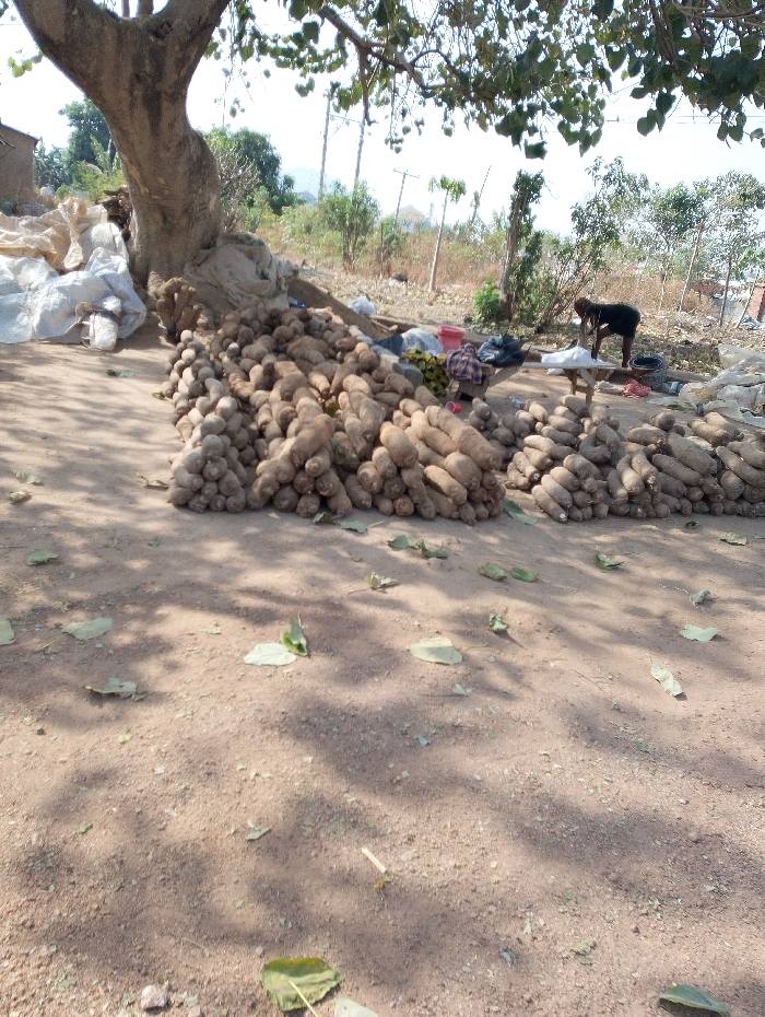 This image depicts an outdoor scene in Kubwa, Nigeria, characterized by dry, reddish-brown earth and a clear, bright sky. The central focus is a significant quantity of yams, piled in multiple large mounds across the midground. A prominent tree with a thick trunk and exposed roots stands on the left, providing partial shade over the scene; its leaves are visible in the upper frame. Against the base of this tree, several light-colored, possibly fabric or plastic, sacks are stacked. In the mid-background, to the right of center, one individual dressed in dark clothing is observed bending over a light-colored wooden table or stand. The background reveals undeveloped land with sparse green vegetation, utility poles, and a distant low hill. Scattered dry leaves are present on the ground. The individual appears to be engaged in an activity involving the items on the table or near the yam piles.