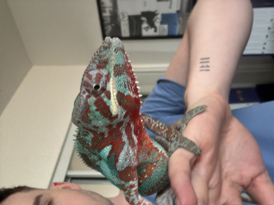 - "An indoor scene, reportedly located in the city of Los Angeles, United States of America, captures a detailed view of a vibrantly colored chameleon perched on the right hand of an adult male" by FM-FHe0a2, licensed under CC BY 4.0