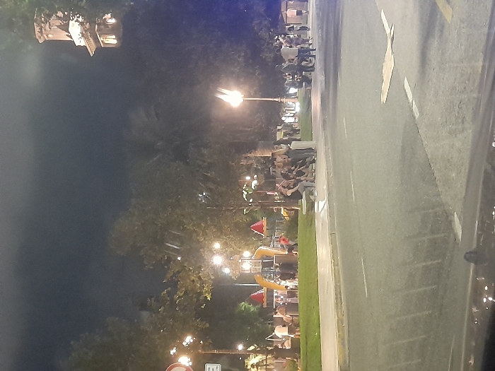 A nighttime shot shows a street and a park area illuminated by various lights. People are seen sitting along the park edge, near lampposts. The street has lane markings and an arrow symbol painted on it. Playground equipment is visible in the park. A building with decorative features is partially visible in the top-left corner. The image has an overall dark and somewhat blurry quality.
