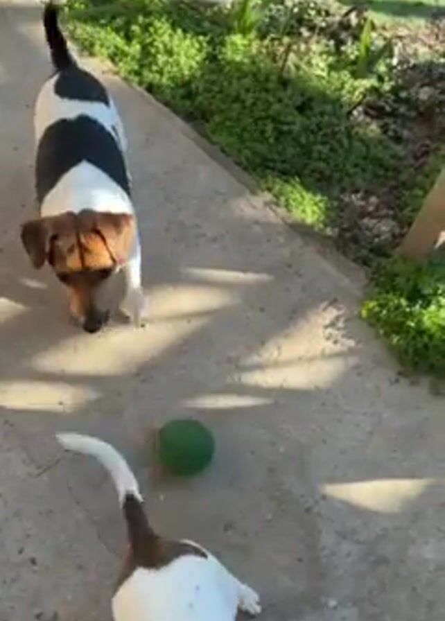 Two Jack Russell Terrier dogs are playing in a backyard. One dog is white with black markings and brown around its head and ears. The other dog is brown and white. There is a green ball on a concrete patio. The black-and-white dog picks up the ball. The background is green grass and foliage. A small alligator statue is visible behind the dogs.