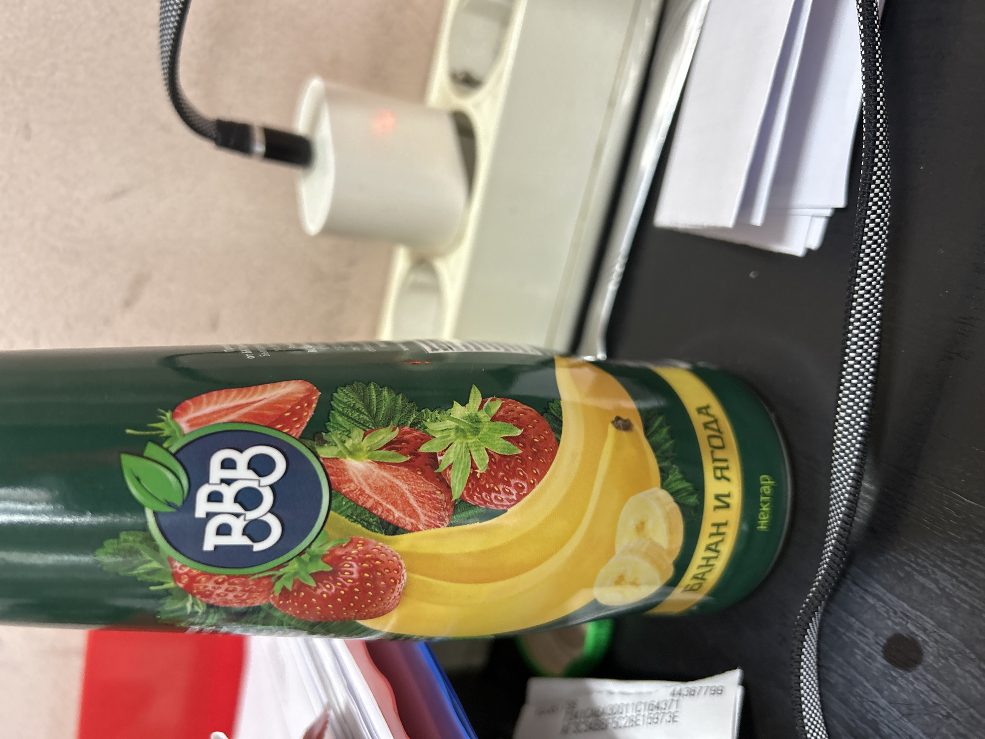A close-up shot displays a bottle of juice featuring banana and strawberry flavors, adorned with Russian text. The bottle is predominantly green and depicts images of bananas and strawberries. In the background, a white power adapter and partially visible papers are noticeable, along with a section of a dark-colored surface. The context of Byala, Bulgaria, is not provided by visual information.