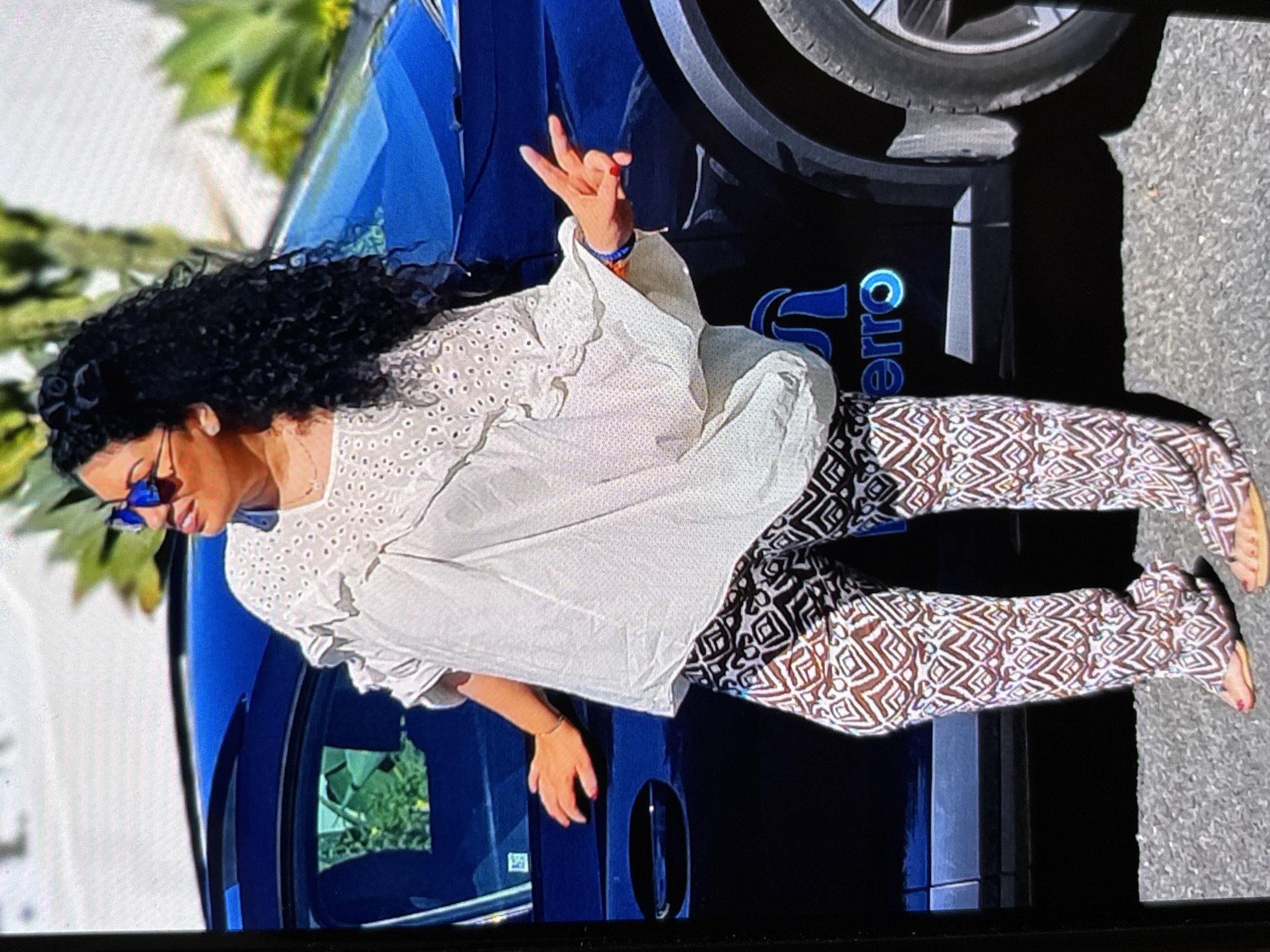 A woman with curly dark hair and sunglasses is leaning against a blue car, giving a "rock on" hand gesture. She is wearing a white blouse with eyelet detailing and patterned pants. The car has the word "Erre" visible on its side. The background is blurred, but appears to be an outdoor setting with some greenery. There is no indication of the location being Sofia, Bulgaria, in the image.