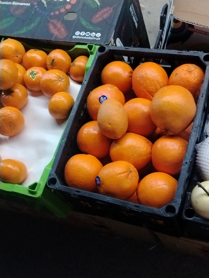 This image captures a close-up, elevated view of fresh produce displayed for sale in what appears to be a market or grocery store in Navoiy City, Uzbekistan. The scene is dominated by numerous citrus fruits, primarily oranges and mandarins, arranged in plastic crates. In the foreground, a black plastic crate is filled with approximately two dozen ripe oranges, many exhibiting a uniform bright orange hue. Several of these oranges bear small, blue circular stickers. Notably, a single, elongated, lighter orange fruit, possibly a type of mango or a specialized citrus, rests among the round oranges. To the left of this black crate, a green plastic crate contains a pile of smaller, deep orange mandarins. Partially visible to the far right, a section of another black crate reveals a white fruit, likely a pear, individually wrapped in a protective white foam mesh. In the background, two cardboard boxes are present. The most prominent is a dark-colored box with white text and graphic illustrations of various fruits, including bananas, mangoes, and papayas. Visible text on this box includes "Premium Bananas" and a social media handle "@donatellafruit" accompanied by platform icons. To the upper right, a section of a plain brown cardboard box is also visible. The lighting suggests an indoor setting. No individuals are depicted in the frame.