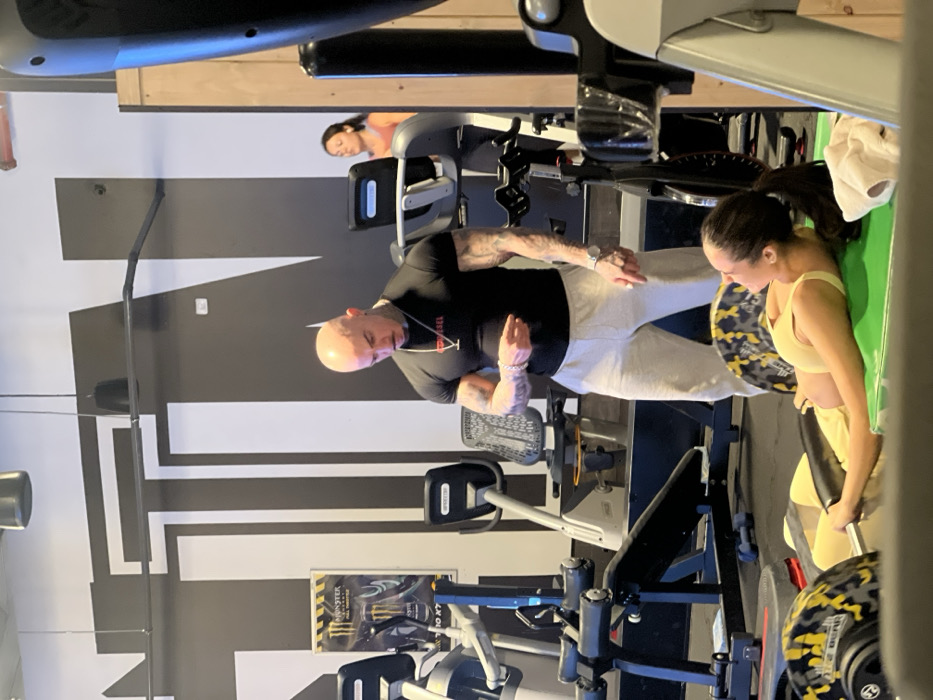This image depicts an indoor gym located in Tel Aviv, Israel. The scene features three individuals amidst various exercise equipment. In the foreground, a bald man with extensive arm tattoos stands, looking down and slightly to his left. He is wearing a black short-sleeved t-shirt with red "DIESEL" text, light grey sweatpants, a silver chain with a crucifix pendant, a silver watch on his left wrist, and multiple bracelets. His left hand is raised slightly, and his expression is focused. On the floor in front of the man, a woman with dark hair tied in a ponytail lies supine on a green exercise mat. She wears a yellow sports bra and matching shorts. A white towel is positioned near her head on the mat. Her body is aligned with a leg press machine, notable for its yellow and black patterned weight plates. In the background, to the right of the standing man, a third woman with dark hair is partially visible on what appears to be a treadmill or stationary bike. She is wearing an orange top. The gym features black walls with large white geometric designs, possibly forming a logo. A poster for "Monster Energy" with visible Hebrew text is affixed to the wall on the left side of the frame. Various other gym machines, including ellipticals and benches, are scattered throughout the facility. Overhead light fixtures are visible.