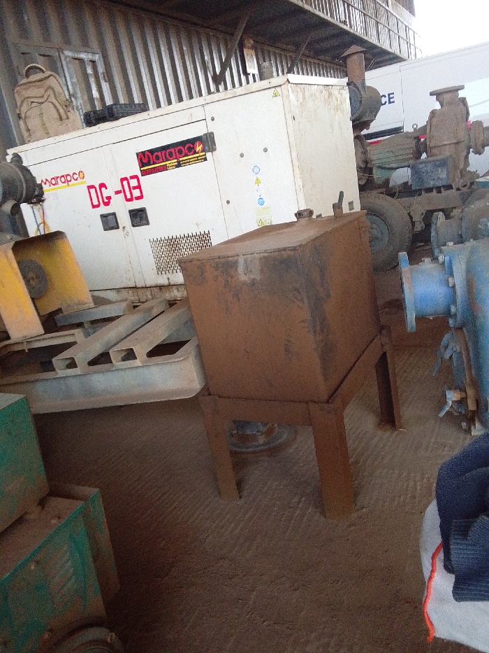 The image depicts an indoor or sheltered industrial space in Hoche, Nigeria. A large, white Marapco DG-03 generator, showing significant dust and grime, is centrally positioned. To the right of the generator, a heavily rusted, cuboid metal tank rests on a four-legged metal stand. Further right, partially obscured, are components of additional machinery, including a blue flanged pipe and a vehicle with "ICE" visible on its side. The floor is composed of packed dirt, exhibiting worn patterns. In the background, corrugated metal walls and overhead wooden support structures are visible, along with a light-colored bag. No individuals are present. The scene indicates a static storage or maintenance area for industrial equipment.