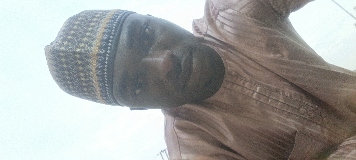 A man is depicted wearing a patterned kufi. He faces the camera directly with a neutral expression. He is wearing a light brown shirt that appears somewhat wrinkled or patterned. The background appears to be a pale sky. The photo is oriented sideways. The overall lighting is bright, with some areas appearing slightly washed out.