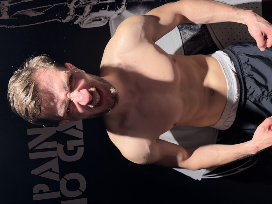 An adult male is centrally positioned in an indoor environment, likely a fitness facility, in Montrouge, France. He is shirtless, displaying an athletic build, and wears black athletic shorts over grey underwear. He has light brown hair and stubble. His facial expression is a grimace, with a wrinkled nose and bared teeth. A white earbud is present in his right ear. His arms are tensed. The dark background features partial white text "PAIN NO GA" on the left and a faint graphic resembling a sports uniform or equipment on the right. The scene is illuminated by strong directional lighting from the top-left, casting distinct shadows.