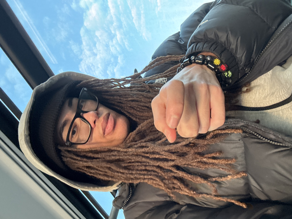 A selfie shows a person wearing glasses, a gray hoodie, and a dark puffer jacket, with a black beanie visible underneath. The person has long, brown dreadlocks. Their arm is extended towards the camera, with a fist clenched tightly and beaded bracelets visible on their wrist. The background is a bright blue sky with scattered clouds, framed by the window of a vehicle. The shot is taken from a low angle, emphasizing the sky and the person's upward gaze.