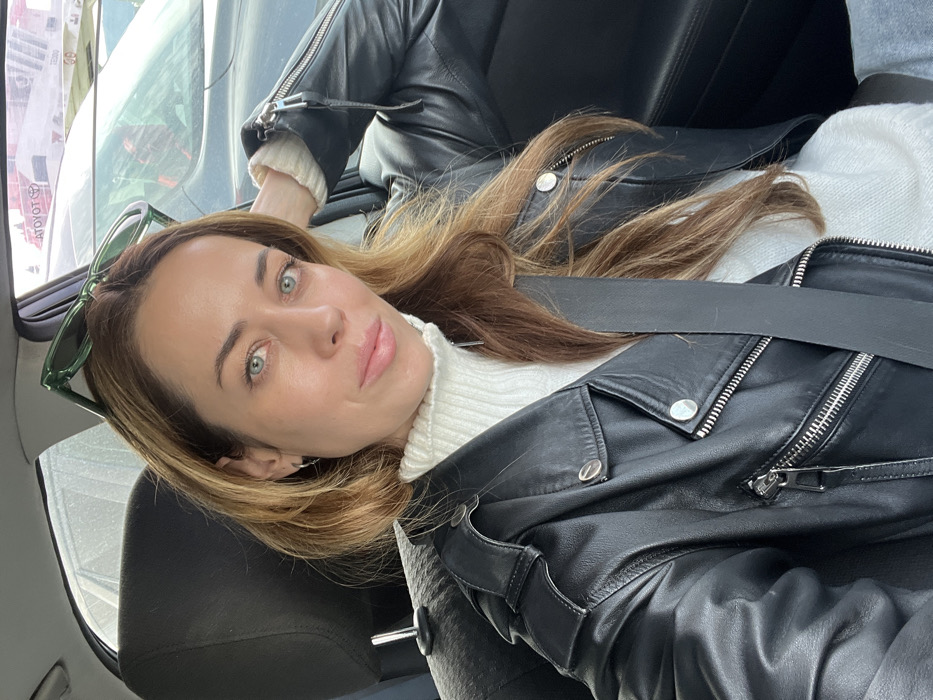 A mid-shot selfie captures a woman seated in the passenger seat of a vehicle in Lepetane, Montenegro. The woman has long, light brown hair, light blue-green eyes, and light pink lips, looking directly at the camera. She wears a white ribbed turtleneck sweater under a black leather motorcycle-style jacket, featuring silver zippers and snaps. A black seatbelt is fastened across her chest. Green-framed sunglasses are perched on top of her head. Her left arm is bent, with the hand resting out of frame, while her forearm is visible against the car's dark interior. Through the car window in the background, a silver vehicle is partially visible, beyond which a white structure or sign with the reversed red text "ATOYOT" (Toyota) and other white framework elements can be discerned.
