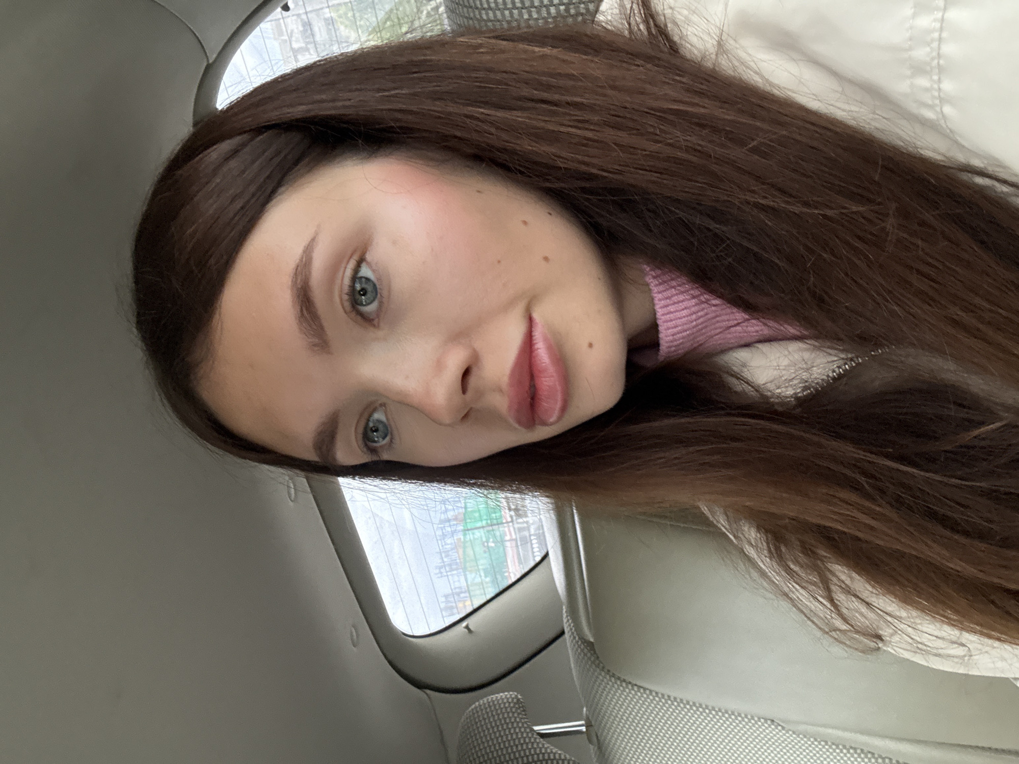 A woman with long, dark brown hair and light blue eyes is looking at the camera. She has fair skin with some freckles and is wearing a pink top and a white jacket. She appears to be in a car, as indicated by the car seat upholstery and a window showing a blurry urban scene with a construction site, which is potentially a building under construction, visible in the background. The location is possibly Livadia Larnakas, Cyprus, considering the prompt's request.