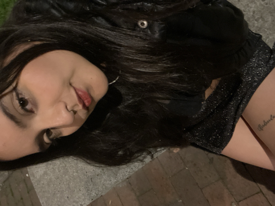 A woman with dark hair and dark eyes is photographed at an angle, showing her face, shoulder, and part of her thigh. She wears a dark jacket and a sparkly dark dress or skirt. There is a tattoo visible on her thigh. The ground appears to be brick or stone. The lighting suggests it is evening. The overall tone is casual.