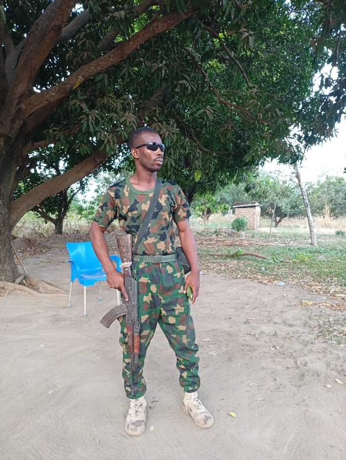 A man in camouflage stands outdoors beneath a large tree. He wears sunglasses, a camouflage top and pants, and boots. He holds an AK-47 rifle across his chest. A blue plastic chair sits behind him to the left. The ground is light-colored dirt. In the background, sparse greenery and a small building are visible.