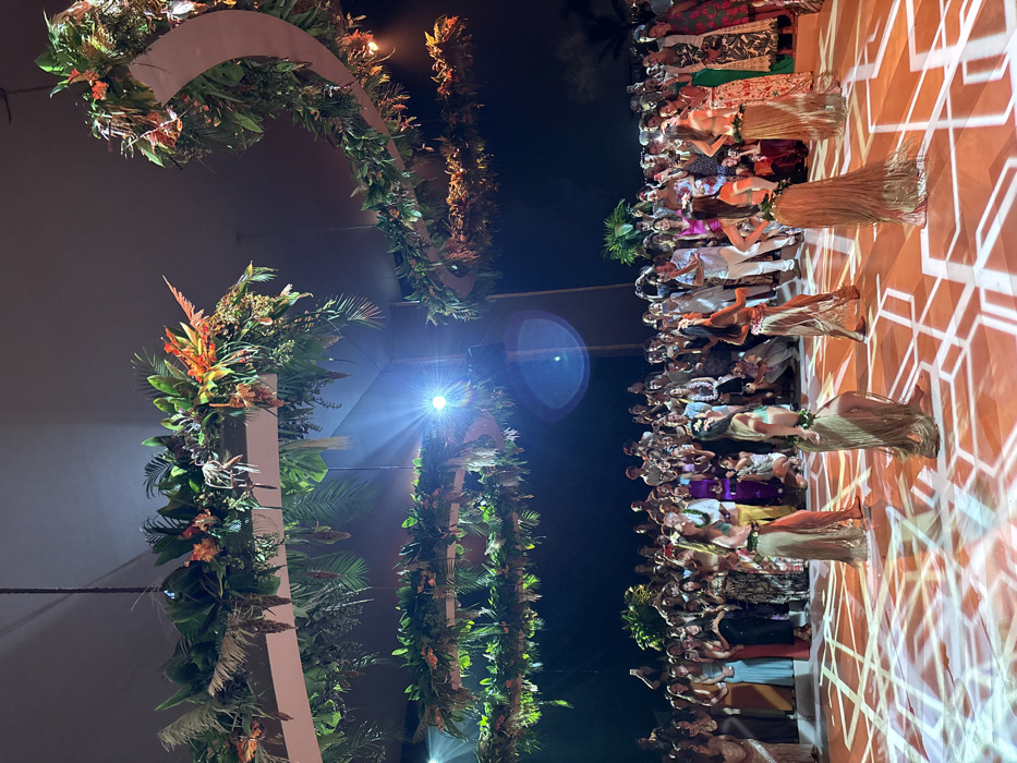 An evening event is depicted in Ancón, Peru, under a large, dark canopy or tent structure. Five women, dressed in tan-colored grass skirts, bikini tops, and floral leis, are performing a synchronized dance on a brightly illuminated, patterned dance floor in the foreground. A large audience, estimated at 100-150 individuals, surrounds the dance floor, observing the performance. Audience members are dressed in diverse semi-formal or festive attire, with many holding up cell phones to record the scene. Overhead, several large, circular, and semi-circular structures adorned with lush green tropical foliage and red-orange flowers hang from the ceiling. Multiple spotlights illuminate the performers and the overhead decor, creating lens flare. The background appears dark, indicating nighttime or an enclosed space.