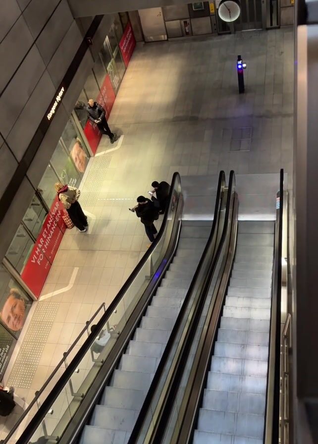 The camera looks downward into a modern subway station featuring two parallel escalators descending into the scene