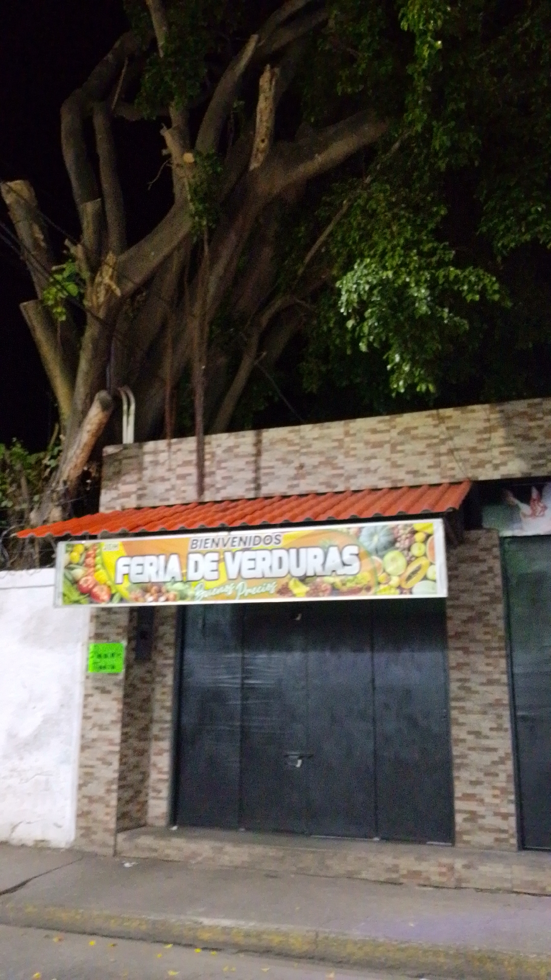 A nighttime shot captures the front of "Feria de Verduras," a vegetable market in Tinaquillo, Venezuela