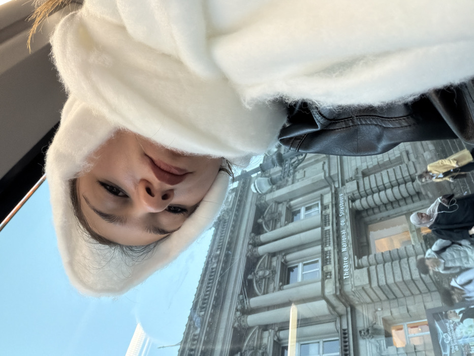 A selfie taken from a low angle shows a woman wearing a white fuzzy hat and a black leather jacket. Outside the window, a building with a sign that reads "Theatre National de Strasbourg" is visible. The reflection in the window shows people walking by. The sky is blue.