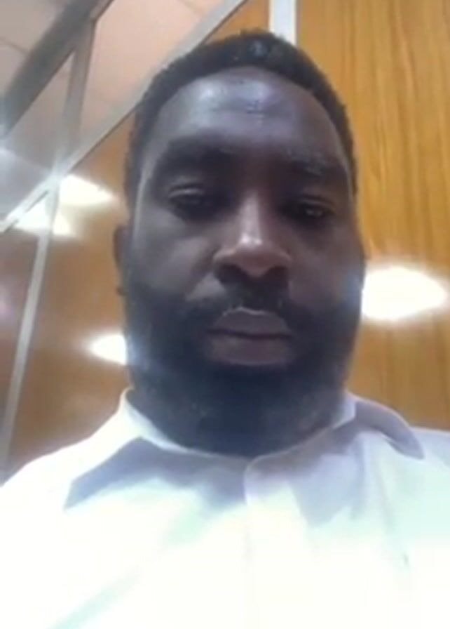 A medium close-up shows a man in a white shirt, looking directly at the camera. He has dark skin, a beard, and short dark hair. The background appears to be an office setting, with a wood-paneled wall and a window partition with frosted glass. The lighting is somewhat bright, causing some glare on the white shirt. The man's expression is neutral.