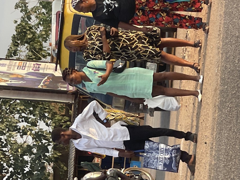 A street scene shows five people walking on a sidewalk. A man in a white shirt and black pants carries a "Victory" bag. Beside him is a woman in a light green dress. Three other women walk close together, wearing different patterns and colors in their clothing. A yellow bus is visible in the background, and a sign with a man's picture on it stands to the left. The scene is brightly lit and appears to be daytime.