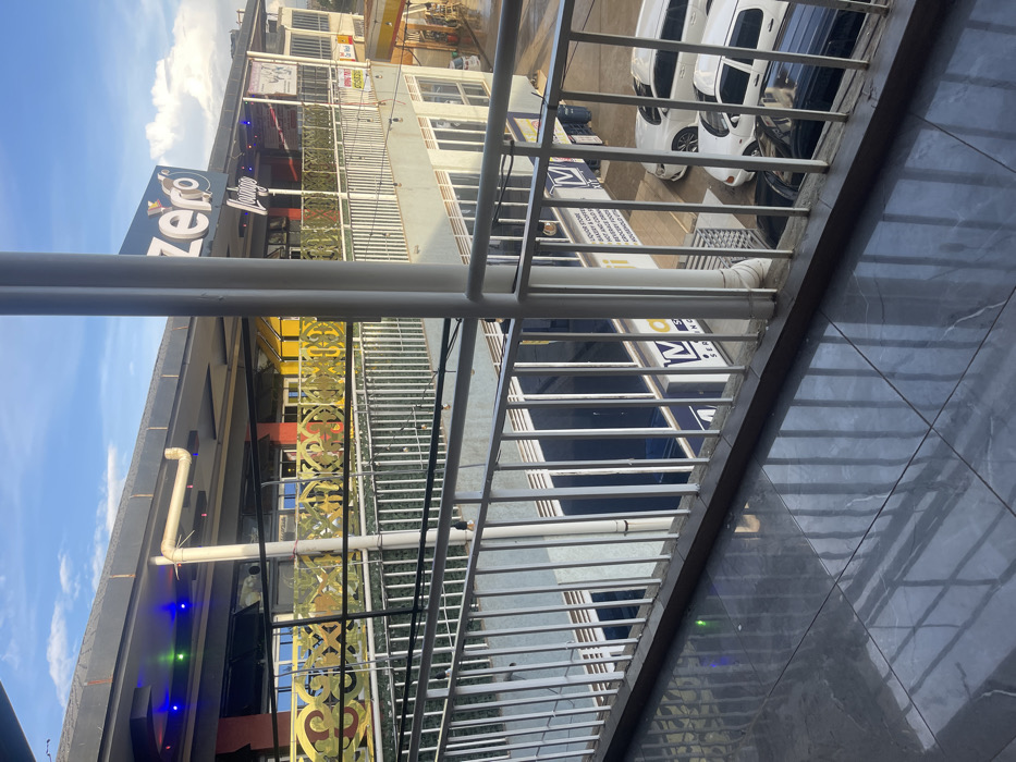 The image depicts an exterior view from an elevated position, likely a balcony, overlooking a multi-story commercial complex in Biashara ward, Kenya, under daylight conditions with a blue sky and scattered white clouds. In the immediate foreground, a dark grey tiled floor reflects vertical white metal railing bars, which form a protective barrier. Directly below, an intermediate level features white metal railings and a green artificial hedge or covering on a balustrade. Further down, the ground level or lower floor of the complex contains storefronts with large reflective windows. A visible sign on this level reads "MO" (partially visible) and "SERVING F...", with an adjacent list of categories: "LIQUOR STORE", "BAKING & COFFEE", "HOT AND COLD DRINKS", "BEVERAGES", "HOUSEHOLD GOODS". A prominent white structural pillar extends vertically through the scene. No individuals are visible on these lower levels. The upper levels of the building feature a large sign with the word "zero" and a target-like graphic, accompanied by "Lounge" underneath, indicating a commercial establishment. This level is adorned with a gold-colored, ornate metal railing with scrollwork. Blue, green, and red LED lights are visible under the eaves of the upper floor structure. To the far right, a yellow canopy with the red Shell logo indicates a gas station. A parking area below contains several parked white vehicles (sedans and SUVs) and one black vehicle. No people are discernible engaging in specific actions or interactions within the frame.