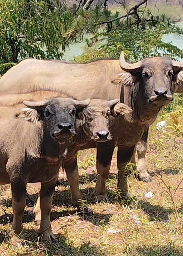 - "three water buffalo standing in a grassy area next to a body of water" by FM-yj6ly1, licensed under CC BY 4.0