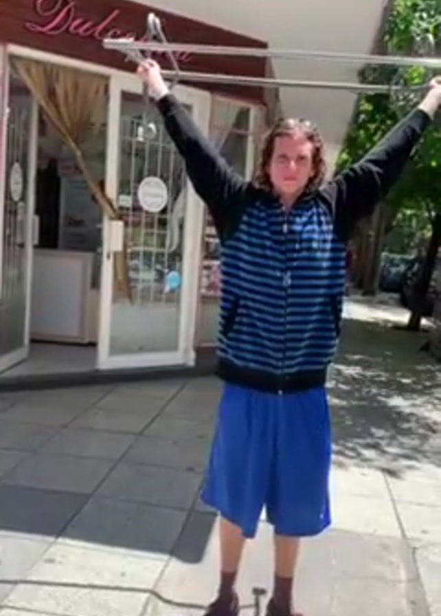 The video depicts a person holding a metallic structure above their head on a city sidewalk