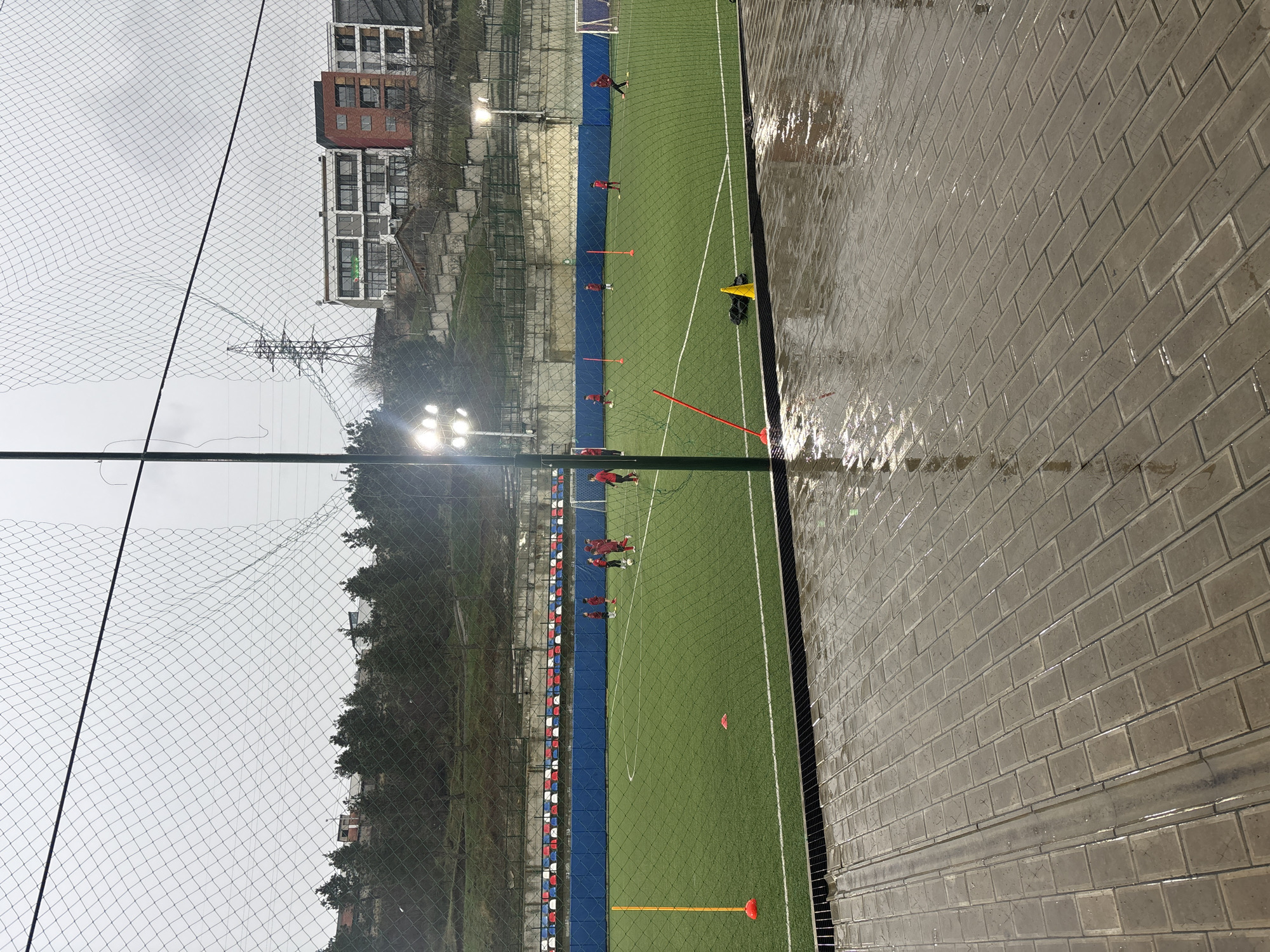 The image captures an outdoor artificial turf football pitch, viewed through a protective black mesh net, under an overcast sky, indicative of an urban sports facility in Tbilisi, Georgia. In the immediate foreground, a wet, reflective surface of grey rectangular paving stones extends across the bottom of the frame, showing light reflections. A black drainage grate borders the paving where it meets the green artificial turf pitch. A dark green vertical pole, part of the netting structure, is visible on the left. The grey mesh net itself dominates the foreground and midground, partially obscuring the scene beyond. On the artificial turf pitch, approximately ten to twelve individuals, primarily children or young adults, are present. Most are dressed in red athletic wear. They are dispersed across the mid-field, some standing, others in motion, with at least one person near a football, suggesting a training session. Several orange and yellow training cones are placed on the pitch as markers. The pitch is illuminated by multiple bright stadium-style floodlights on tall poles, with prominent light arrays visible on the left and right sides. A blue perimeter wall runs along the far side of the pitch, topped by a spectator seating area featuring distinct rows of red, white, and blue seats. A white goalpost with netting is partially visible on the far right. In the background, behind the seating, a steep, tree-covered hillside with numerous evergreen trees rises. Above this foliage, several multi-story buildings are visible: one with a white facade and dark window frames, another with red brick siding, and a third with a lighter exterior, consistent with modern residential or commercial architecture. A large metal lattice electricity pylon stands against the uniformly grey, overcast sky in the upper left section of the background.