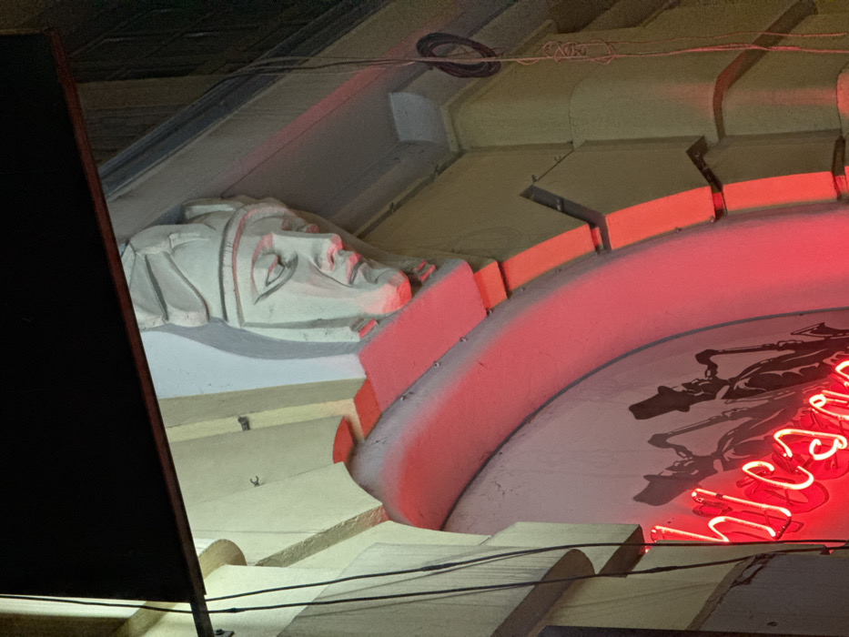 The image captures an architectural relief of a male bust integrated into a building facade at night
