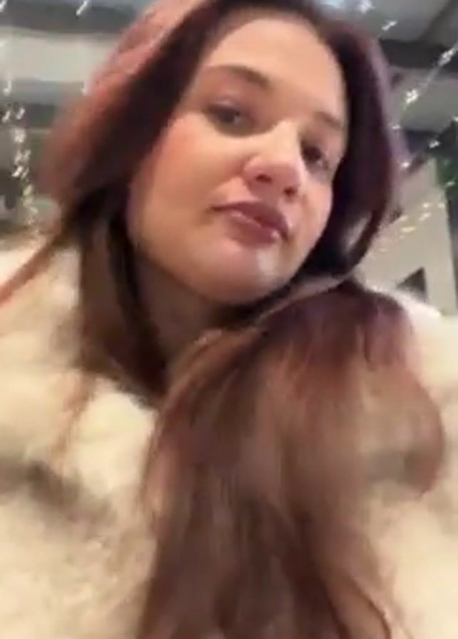 A woman with auburn hair and light skin wearing a light-colored, fluffy coat is filming a selfie video