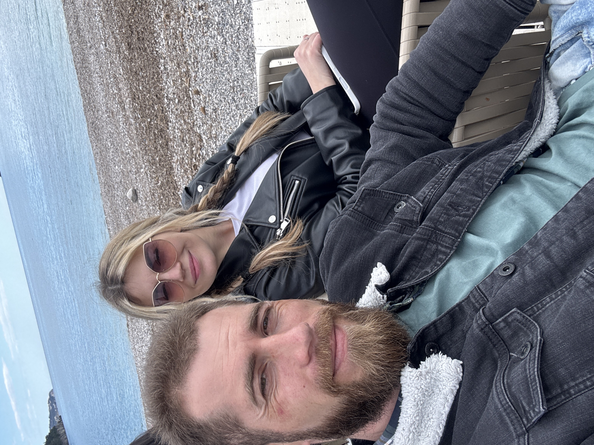 A selfie shot, rotated counterclockwise, shows a couple posing against a coastal backdrop