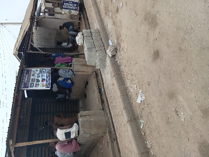 A roadside structure houses seated individuals, possibly customers or staff. A sign reading "ABDUL-SALAM BATTERY TECHNOLOGY" hangs prominently. Stacks of cinder blocks sit to the side, and a sign proclaiming "THE CENTRE OF EXCELLENCE" is visible above. The area is a dirt road, with some scattered trash and debris. The scene suggests a small business operating in a modest, outdoor setting.
