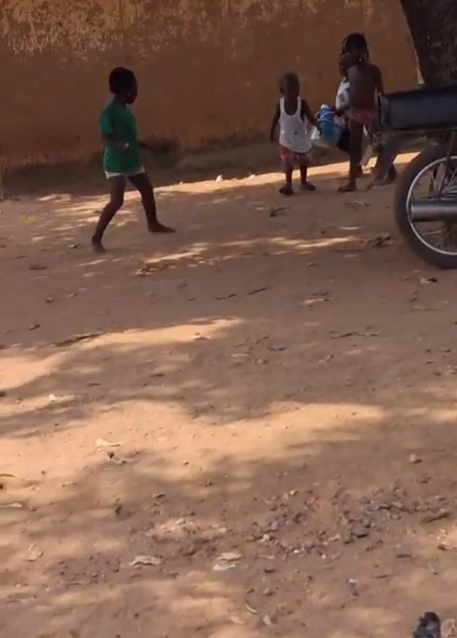 dirt yard in a rural area. Several children are playing near a red motorcycle parked under a tree. A woman is seen doing laundry in the background. The ground is covered in dirt and scattered debris. There are also buildings and household items visible in the background.