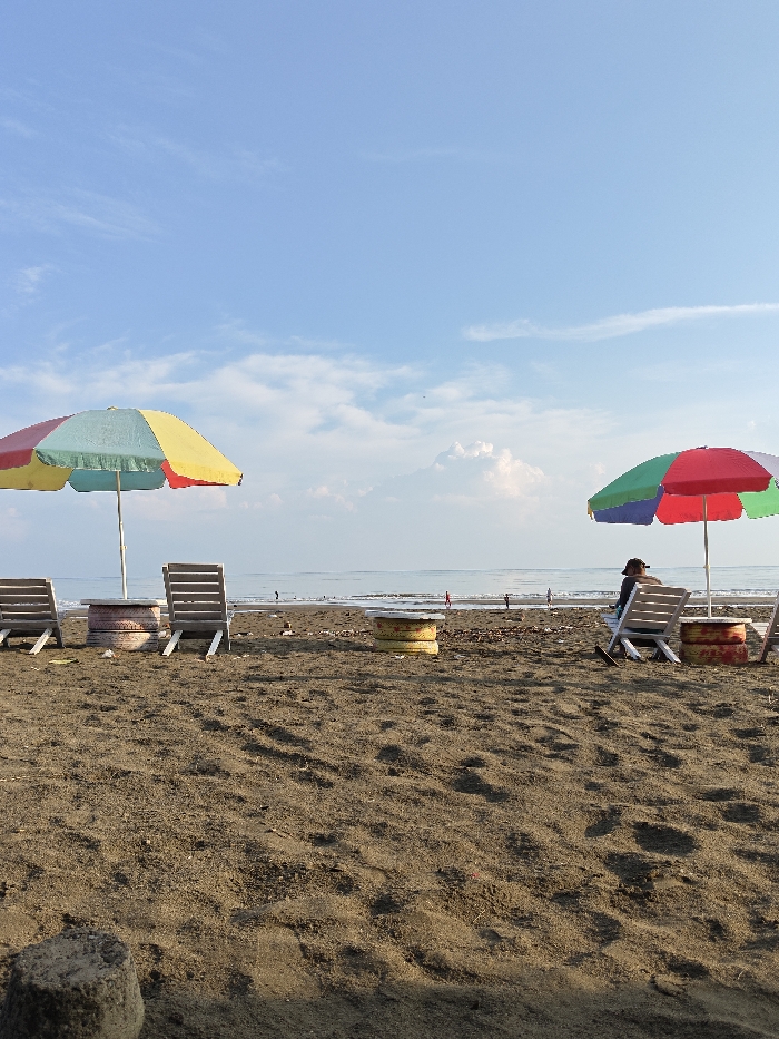 This image depicts a beach scene in Reudeuep, Indonesia, under a clear blue sky with scattered white clouds. The foreground consists of dark, granular sand marked with footprints. Two multi-colored beach umbrellas are centrally positioned; the left umbrella is primarily yellow, red, and light blue, while the right umbrella is red, green, and blue. Beneath each umbrella are two light-colored wooden lounge chairs and a small table constructed from stacked, painted vehicle tires (one yellow/white, the other red/yellow/white). One person, wearing a dark top and a dark baseball cap, is seated in a chair under the right umbrella, facing the calm ocean horizon. In the mid-ground, near the waterline, several small, indistinct figures are visible, some appearing to walk. The beach near the water's edge contains scattered debris. A concrete post or similar cylindrical object is partially visible in the lower-left corner of the foreground.