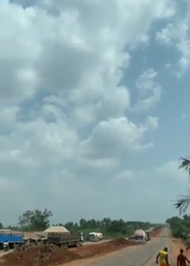 The video depicts a view from inside a moving vehicle, likely a car or truck, traveling down a paved road in a rural area. The sky is cloudy with patches of blue. In the initial shots, two people are walking along the side of the road. Several trucks and vehicles are parked along the roadside. The surrounding environment is characterized by trees and low-lying structures. The camera angle shifts to focus on the windshield wipers of the vehicle. The wipers are inactive.