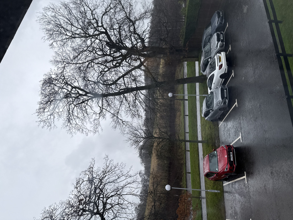 The image depicts an outdoor scene in the City of Edinburgh, United Kingdom, on an overcast day, observed from an elevated perspective, likely a building window, with a dark horizontal structure visible at the top edge. The ground, including asphalt and grass, appears wet, suggesting recent rain. In the immediate foreground, a dark asphalt parking lot is visible, featuring white painted parking lines. Six vehicles are parked. From left to right: a red MG ZS EV with license plate "LJ76 JBN"; a silver Ford Puma with license plate "EO16 WK"; a white Mercedes-Benz C-Class Coupe (W204) with license plate "XT11 ***"; a silver/grey BMW X-series SUV; a dark grey/black BMW X-series SUV with license plate "*** JDN"; and a portion of another dark vehicle on the far right. A dark low fence runs along the bottom right edge of the frame. Beyond the parking lot, a strip of wet green grass is present, followed by two streetlights featuring spherical white lamps on tall grey poles. A wet asphalt road, possibly a dual carriageway with a central grassy reservation, stretches horizontally across the midground. Further back, a gently sloping hill is visible, covered in light brown grass and numerous leafless deciduous trees, their bare branches silhouetted against the grey sky. The sky itself is uniformly overcast with no direct sunlight. No people are visible in the scene.