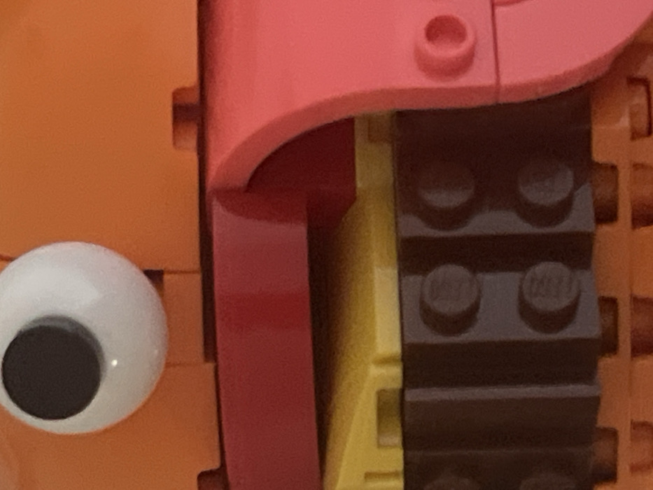 The image displays a close-up, static scene of a multi-colored construction built from interlocking plastic bricks. The subject is a stylized, partial figure or object. A prominent white spherical element with a black circular pupil, resembling an eye, is positioned in the upper left, showing a small light reflection. This eye is set against an orange, brick-textured background. Below the eye, a horizontal red rectangular brick is visible. Beneath the red brick is a yellow rectangular plate. Further down, multiple dark brown or black rectangular bricks are interlocked, some showing faint "LEGO" branding on their studs. To the right, a curved, bright pink element with a circular hole is present, suggesting a rounded feature such as a mouth or a contoured body part. No human figures are present. The interaction involves the mechanical interlocking of the bricks. The immediate environment consists solely of the interconnected plastic components, offering no discernable real-world geographical context.