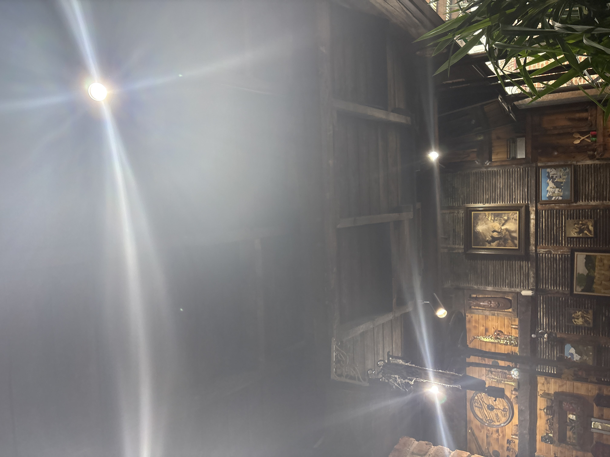 The image displays an interior space located in Krumovgrad, Bulgaria, characterized by a rustic design predominantly featuring dark wood. The ceiling exhibits exposed wooden beams and planks. The walls are clad with dark wooden panels, interrupted by sections of horizontal wooden louvers. A brick column is visible on the left side of the frame. Multiple overhead spotlights provide illumination, generating distinct lens flares across the upper portion of the image. The space is extensively decorated. On the upper left wall, a large circular wooden object, consistent with a clock face, is mounted. Below this, multiple shelves hold various objects, including bottles and an antique camera. A large, dark, textured wooden sculpture, partially adorned with fibrous material, hangs centrally from a ceiling beam. The primary wall section to the right features several framed items: a large, dark painting depicting multiple figures, a golden saxophone, and a carved wooden mask are arranged at an upper level. Below these, multiple smaller framed pictures, including a cityscape, a landscape, and additional figurative scenes, are mounted. A small shelf beneath the lower paintings displays two crossed wooden spoons. In the lower right foreground, a large green potted plant with prominent leaves is visible, partially obscuring a darker architectural opening or window. No individuals are present in the depicted scene.
