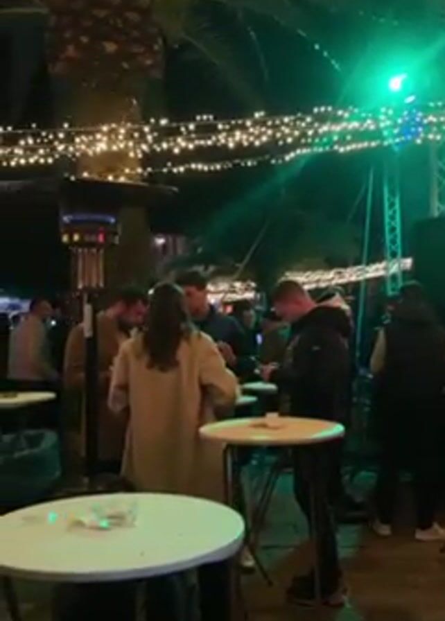The camera pans slowly across a crowded outdoor event at night. Multiple people are gathered around white, small tables, eating and drinking. String lights hang overhead. There are palm trees and standing heaters. A green spotlight is visible in the background. The ground appears to be paved with brick.