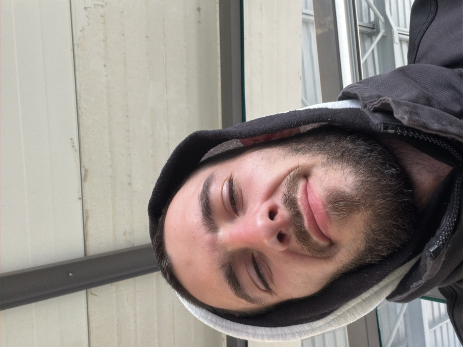The image displays a close-up, low-angle selfie of a male individual in Yoakim Gruevo, Bulgaria. The subject has fair skin, dark brown hair, a full beard, and a mustache. He is wearing a dark, possibly black, zippered outer garment with the hood pulled over his head, revealing a lighter-colored, likely white or light gray, hooded garment underneath. His eyes are partially closed, presenting a squinting appearance, with a noticeable reddish tint on the tip and bridge of his nose. His lips are closed, forming a subtle upward curve. The background consists of a light-colored overhead structure with horizontal paneling. A dark, diagonal structural beam is visible in the upper-left portion of the frame, and a horizontal light-colored bar is present on the right side of the background.
