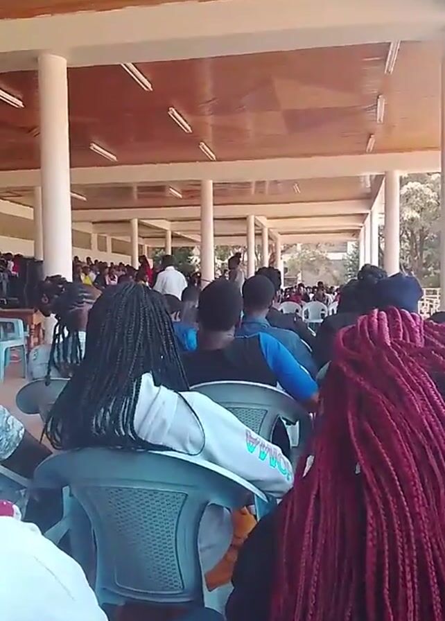 large gathering of people, mostly Black, sitting in rows of chairs under a covered open-air structure. The structure has a wooden ceiling supported by white pillars. People are facing a stage area at the front, where some individuals are standing or moving around. Some people are wearing light-colored clothing, others are wearing darker colors. Several people in the foreground have braids of different colors. The overall setting looks like an outdoor event or assembly.