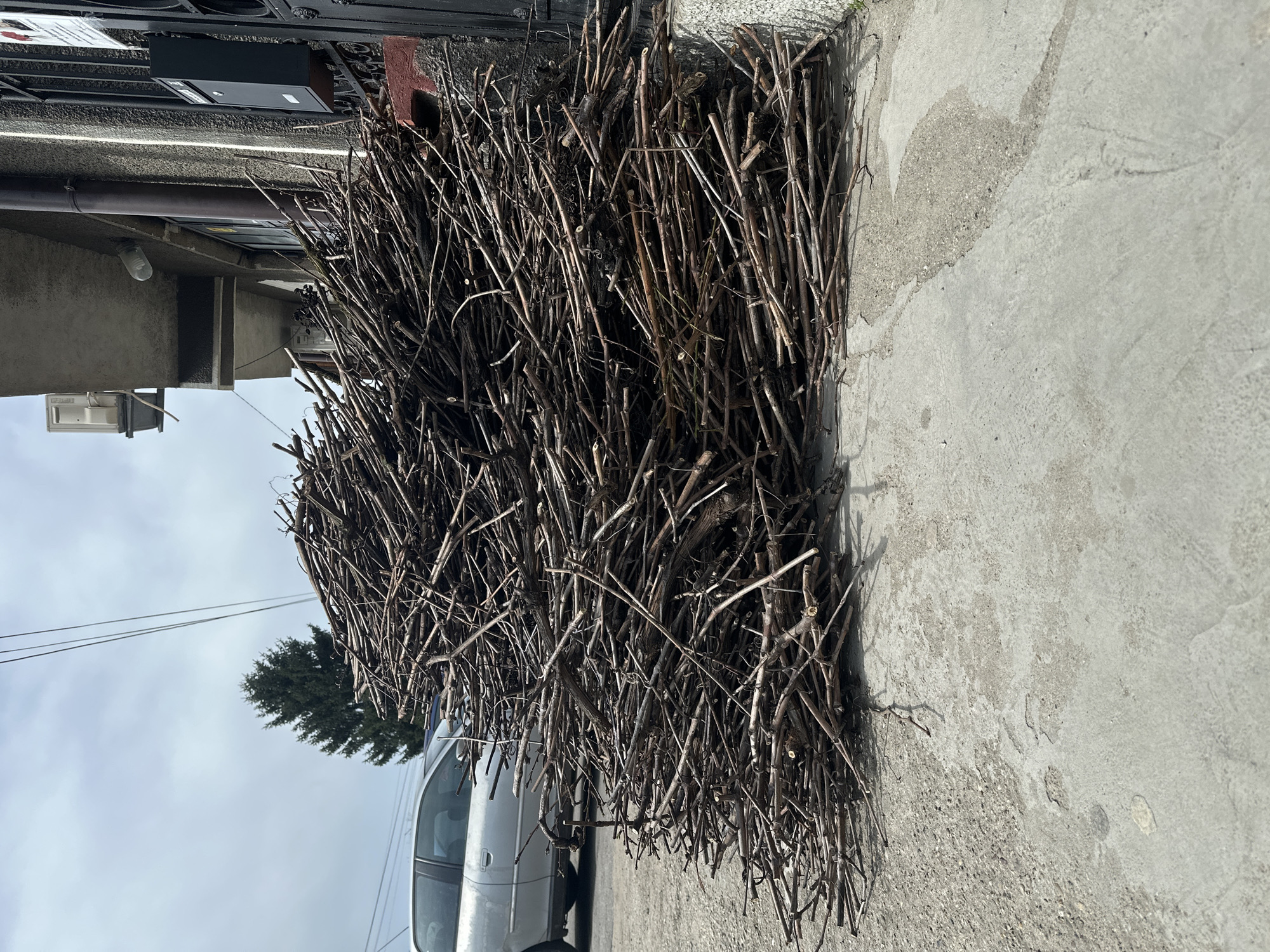 An outdoor scene in Tutrakan, Bulgaria, features a large, disorganized pile of dry, thin, dark brown tree branches and twigs occupying the central and lower-right portions of the frame. This pile rests on a light grey concrete surface, which exhibits minor cracks, staining, and exposed aggregate, extending from the foreground. To the left, a silver or light grey passenger vehicle, possibly a compact sedan or hatchback, is partially visible, parked on an unpaved or gravel surface behind the branch pile. To the right, a building facade with a textured, grey exterior is present. Features on the building include a dark metal gate with decorative scrollwork, a black wall-mounted mailbox, and a section of the lower wall painted red. A vertical downspout is visible along the building, as well as an exterior light fixture with a clear bulb. An outdoor air conditioning unit is mounted on an upper ledge or balcony of the building. Overhead utility wires traverse the upper portion of the frame against an overcast or partly cloudy light grey sky. In the upper-left background, a dark green coniferous tree stands against the sky. No individuals are present in the scene.