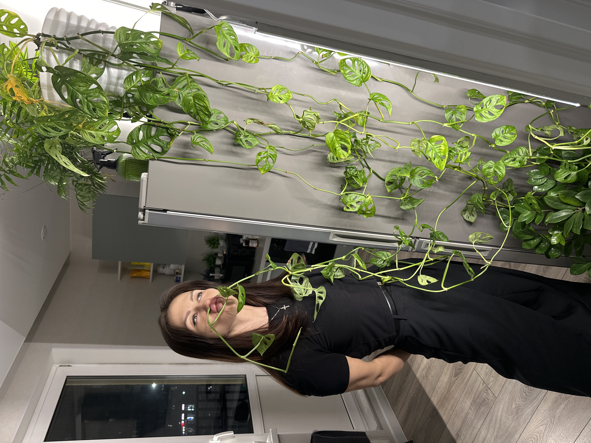 A medium shot captures a woman standing indoors alongside a wall adorned with a large potted Swiss cheese vine. The vine is trained along the wall, illuminated by a strip light mounted above. The woman is wearing a black dress and is positioned such that the vine's tendrils are near her face. The background includes a window revealing a night scene, suggesting the image was taken in an urban setting. The location is Murino, Russia. Other elements visible include a cabinet and shelving in the background.