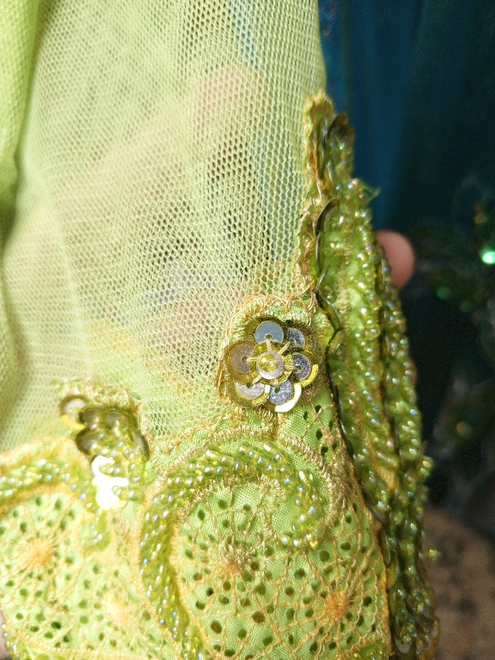 A close-up showcases green, sheer fabric adorned with intricate embellishments