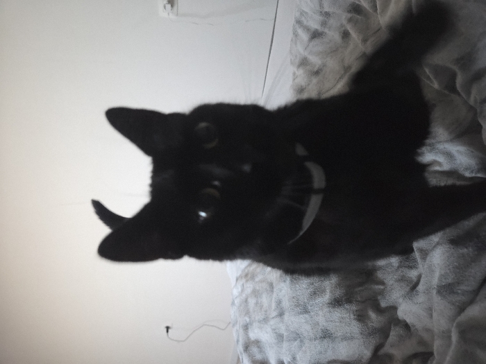 A black feline, wearing a light-colored collar, is centrally positioned and faces directly towards the viewer. The animal is seated on a textured, grey or light-colored blanket or bedspread. Its eyes exhibit distinct light reflections. The background consists of a plain white wall. An electrical outlet with a thin, dark cord plugged in and hanging downwards is visible on the left side of the wall. Another electrical outlet or fixture is present on the right side of the wall. The image exhibits a limited depth of field, resulting in slight blurring of the subject and background elements. There are no discernible visual cues within the image to indicate its specific location within the city of Eeklo, Belgium.