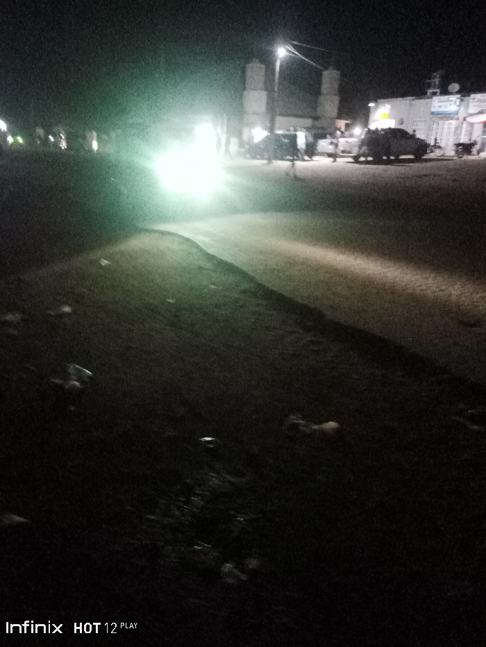 A nighttime scene unfolds with a car's bright headlights illuminating a dark road. The road's surface is rough and textured, strewn with scattered debris. In the background, indistinct figures mill about near a building with distinctive tower-like structures. Additional parked vehicles and a motorcycle are visible further back. The overall atmosphere is one of low visibility, with most details obscured by darkness.