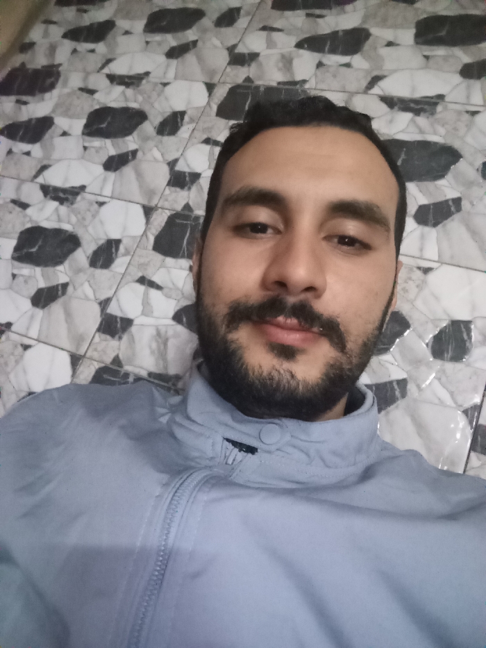 A man with a dark beard and light brown eyes looks directly at the camera. He wears a light blue jacket with the zipper partially visible. The background features a wall or floor covered in patterned tiles of gray, white, and black. The overall composition suggests a self-portrait taken indoors, possibly lying down.