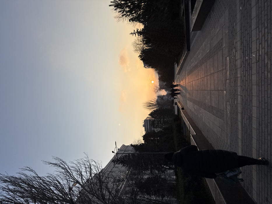 The image depicts a wide urban pedestrian boulevard at sunset in Rostov-on-Don, Russia. The location is Bolshaya Sadovaya Street, looking eastward, with the Rostov Oblast Government building (Bolshaya Sadovaya Street 47) partially visible on the left. The scene is illuminated by the low-angled, orange light of the setting sun, which appears as a distinct orb near the horizon in the center-right. The sky transitions from a pale blue overhead to warm orange and pink hues near the horizon, with minimal cloud cover. The environment suggests a late autumn, winter, or early spring season, characterized by numerous bare deciduous trees interspersed with dark evergreen conifers lining both sides of the boulevard. In the immediate foreground, a broad paved walkway composed of patterned grey and dark grey rectangular pavers extends into the distance. Steps are visible at the very bottom. On the left side of the path, a single individual, seen from behind, walks away from the camera. This person is dressed in a dark, possibly padded, winter coat and a dark hat, carrying a striped bag in their left hand. To the left, a large, multi-story grey building with visible windows is partially obscured by bare tree branches. A modern black streetlamp stands in front of this building. Along the left edge of the pathway, a section of dense green bushes is present. Further down the central axis of the boulevard, a group of approximately five to six individuals is walking towards the setting sun. Their figures are largely silhouetted against the bright light, making specific details of their attire indistinguishable. The path reflects the orange light of the sun, casting long shadows ahead of the individuals. To the right, the path is flanked by dark, rectangular planters or raised sections, beyond which a dense line of dark evergreen trees and bare deciduous trees extends into the background. Distant urban buildings are visible on the horizon, partially silhouetted against the bright sky.
