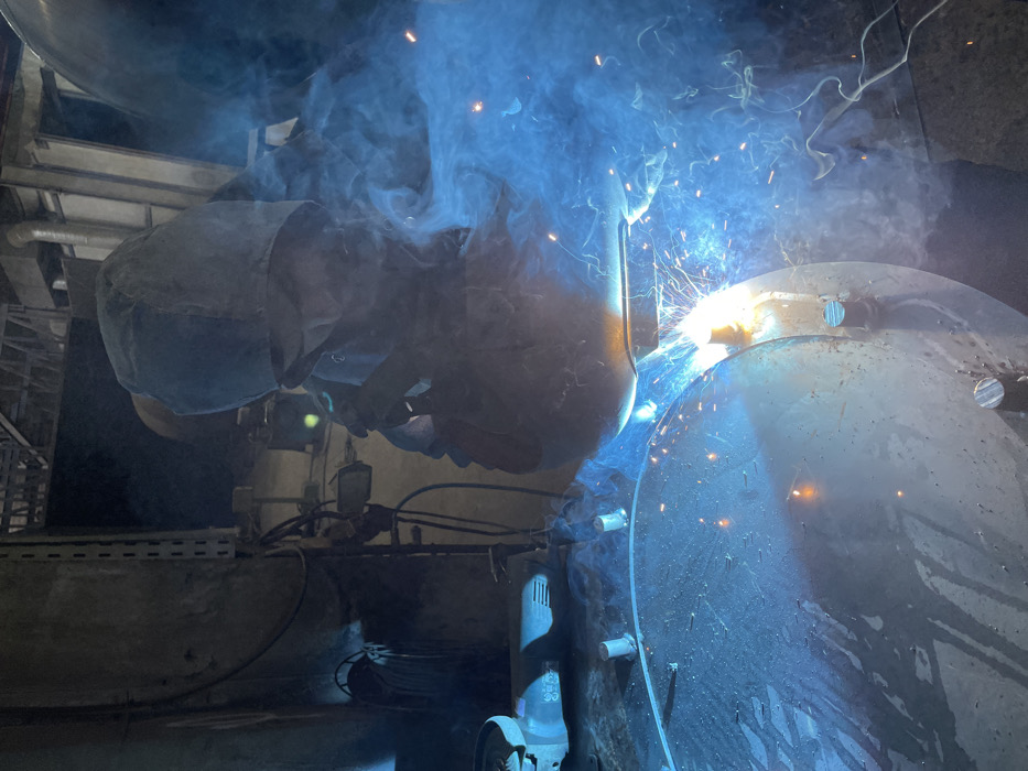 The scene depicts an industrial welding operation occurring within a facility located in Tomba, Montenegro